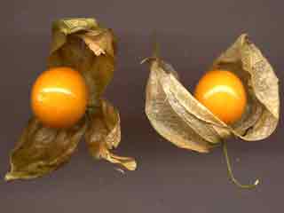 PHYSALIS peruviana edulis. Ananaskirsebær fra Peru. Usædvanlig plante med små saftige tomatlignende delikatessefrugter, med en unik udsøgt smag Dekorativ bl.a som dessertbær med deres lanterne lignende gule hylsters omfring frugterne - dyrkes lige så let og på samme vilkår som tomater, både inden- og udendørs.