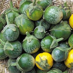 Store klaser af 5-7 cm frugter med grønne striber på den øverste del. Smager bedst som små, helt fantastisk. kan bruges som almindelige auberginer desuden smager de rigtig godt grillede. Meget frugtbare planter på ca. 1 meter. 15 frø