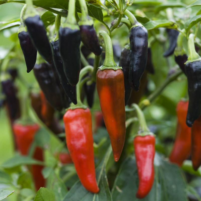 En mellemstærk sort med en lille vækst. Planten bliver 45-60 cm høj så den er super velegnet til dyrkning i krukke. Den sætter et væld af lilla frugter som modner til en dyb rød farve, og kan bliver op til 7 cm lange.