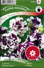 Velkendt udplantningsplante, passer godt i altankasser, krukker og ampler. Her i flot farvekombination af dybt violette blomster med en rent hvid, bølget spidskant. Dobbelte blomster, ca. 10 cm store og meget vejrbestandige. Trives i porøs plantejord, gødes jævnligt.