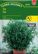 Beskrivelse: Sar vokser naturligt i Sydeuropa og har en krydret smag. Passer godt til f.eks. bønner, kål- og pølseretter. De spæde blade høstes løbende og anvendes friske eller tørrede. Høstes ofte, så planten holdes busket og fin. Hele planter kan høstes lige inden de blomstrer og tørres. De søde, lilla blomster tiltrækker insekter. Trives i porøs jord et solrigt sted. Velegnet til dyrkning i potter f.eks. på terrasse/altan.