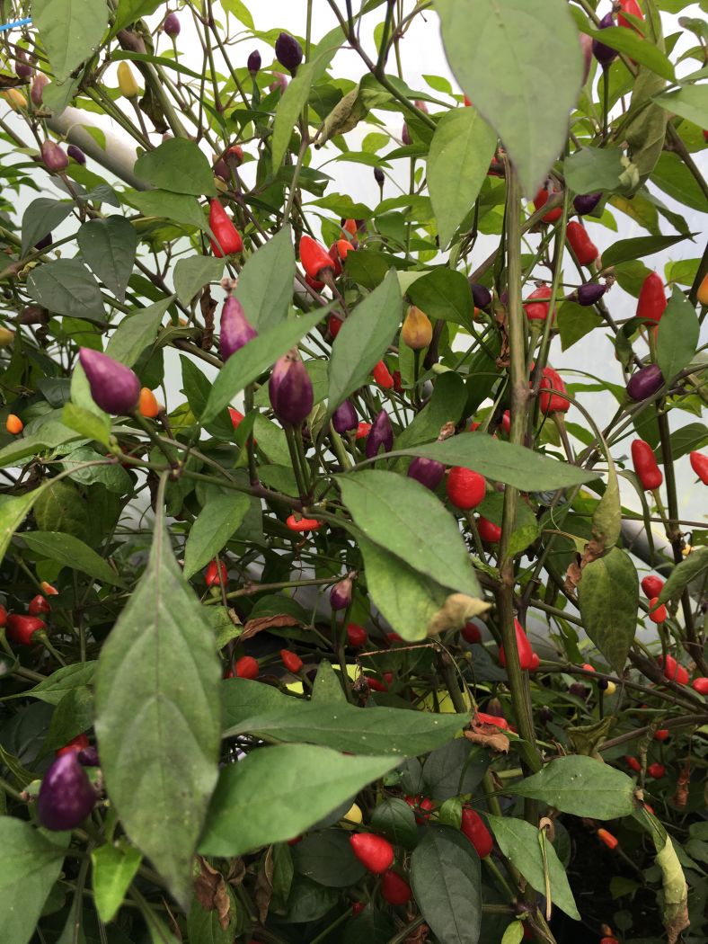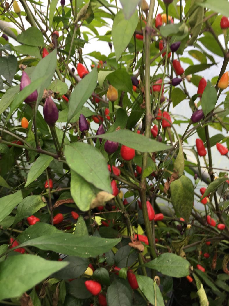 Masser af dråbeformede chili frugter der skifter i farver fra lilla/violet til gul til orange til rød, med alle farverne samtidig på planten hvilket gør den særdeles velegnet til krukker. Bærer altid – hvis man overvintrer dem indendørs. planten har rød- lilla blade og bliver ml. 60-100 cm. høj – Styrke 6.