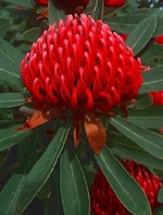 dette busk/træ er kendetegnet for New South Wales, Australien. Den kan blive op til 3 meter høj, og 1½ meter bred, med oprette stive kileformede blade som ender ud i klare dybrøde blomster som bliver op til 15 cm. i diameter og er omgivet af bløde røde dækblade. den er delvist frosttolerant. Den blomstrer fra foråret og kan sagtens sætte over 100 blomster på en sæson. Blomsterne er meget velegnede til buketter og dekorationer. derudover producerer den masser af nektar som fugle, bier og sommerfugle flokkes om.