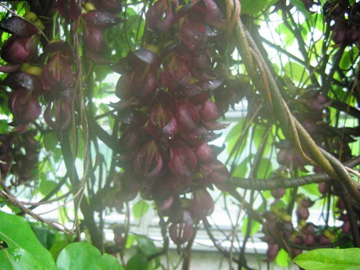 Fløjlsbønne - Mucuna Sempervirens - En helt fantastisk slyng- klatreplante som stammer fra Kina og Japan hvor den er meget populær. den er hurtigvoksende og stedsegrø,. Især blomsterne er meget specielle og utrolig smukke, de hænger i store klaser på op imod 20 blomster i en dramatisk sort- lilla farve hver enkelt blomst er meller 7,5 - 10 cm store. De efterfølges af op til 40 cm fløjlsagtige bælge med store frø. Planten tåler ikke frost. 3 store frø
