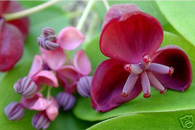 Akebia Quinata, Kraftig slyngplante med røde duftende blomster. Frugt bliver lysviolet og er meget dekorativ om efteråret. Bladene er saftigt grønne og femkoblede. Tåler halvskygge med dræn. Tåler ikke at stå fugtigt. Kan blive op til 8 m høj voksende op af stativ eller lign. 5-6 frø