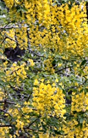 laburnum Anagyroides 5-6 meter højt træ fra ærteblomstfamilien. Den blomstre overdådigt i maj-juni. Frøene er giftige. 5 frø