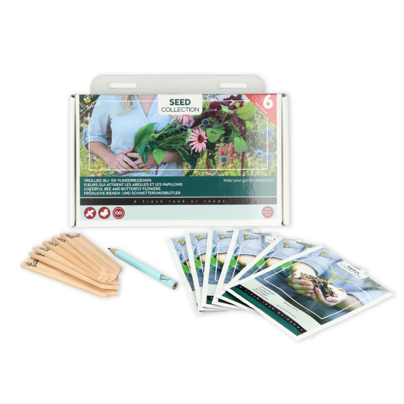 Denne pakke indeholder seks nøje udvalgte blomstersorter, som fungerer som en kærkommen fødekilde for bier og sommerfugle – og samtidig skaber en smuk og farverig blomsterflor i haven eller i krukker. Det er det perfekte valg for dig, der vil gøre noget godt for de nyttige insekter, mens du nyder et levende og dekorativt bed.