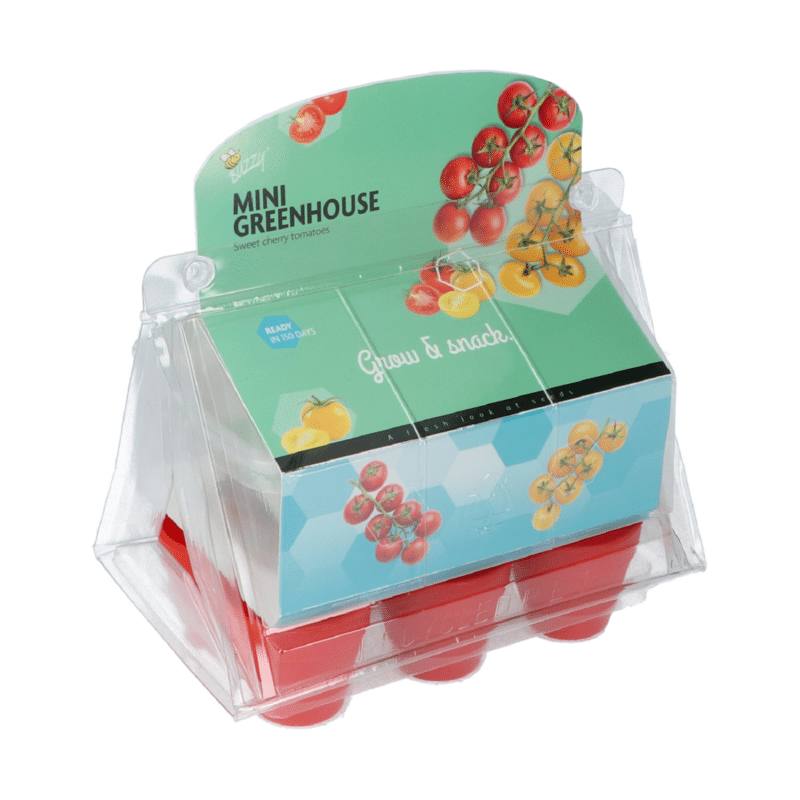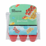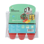 Mini drivhus. Komplet med 6 plastikpotter, såjord og tomat frø af sorterne Gardeners Delight (rød) og Cereza Amarilla (gul)