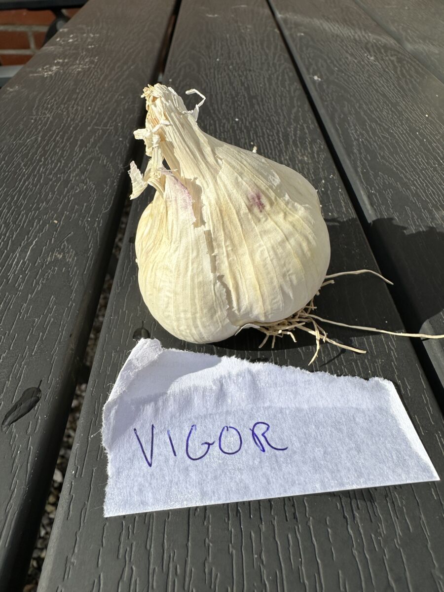 Vigor er en højtydende sort som stammer fra Amerika. Hvidløget er hvidt med lilla toner, frisk smag og ret stærk som rå - fyldig og fed med sødme som ristet.
