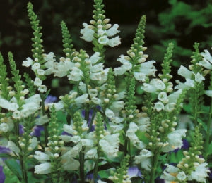 Physostegia, 70 cm høj staude med hvide blomster i juni - september. ynder Fuld sol. Er meget velegnet som snitblomst.