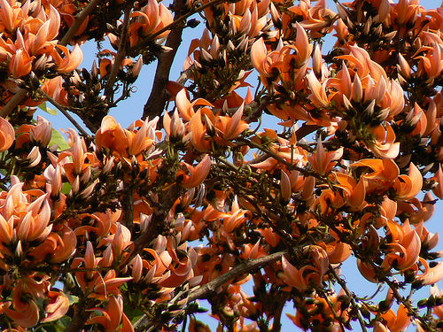 det er et meget specielt træ, med krogede og irregulære stamme og grene. Om vinteren er det i sandhed grimt, men når foråret kommer forvandler træet sig til et sandt inferno af utrolig smukke rødorange blomster som set fra forskellige vinkler funkler over i en smuk sølv/laksefarve. den stammer oprindeligt fra det centrale indien, men findes mange steder på grund af dets skønhed. 5 store frø.
