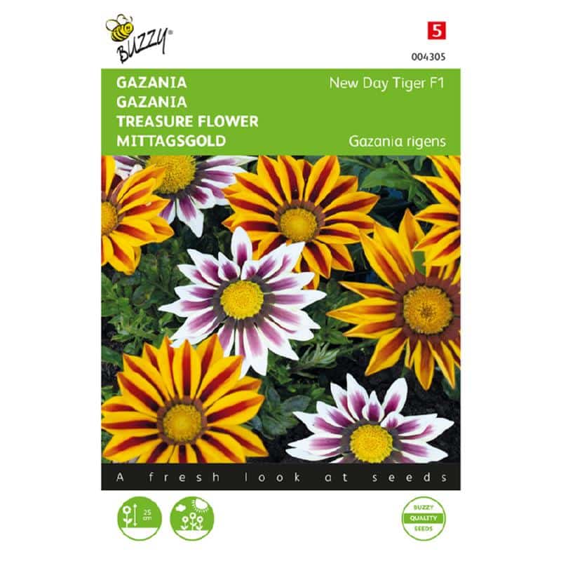 En meget smuk variant af Gazania med 10cm store blomster i spraglede klare farver. Tiger F1 lukker blomsterne om aftenen og når der er lidt dagslys.
