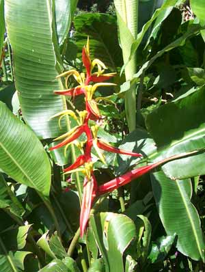 Heliconia Schiedeana Hummerklo eller Papegøjenæb - Stammer fra det sydlige Mexico. Planten kan blive op til 2 meter høj med store skinnende grønne blade. En af de bedst kendte og mest populare af heliconia familien. Planten har en stor hængende blomsterstand med skinnende røde papegøjenæbs lignende blomster med gul kant - blomstrer hele året. er dog ikke hårdfør. 5 frø