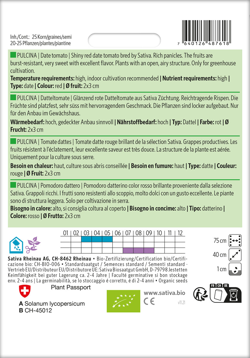 Skinnende rød dadeltomat fra Sativa-avl. Frugterne er faste, meget søde med en fremragende smag. Planterne er løst bygget. Kun til drivhusdyrkning.