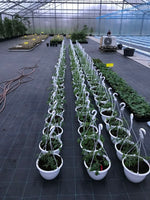 I kraftig plast - diameter 25 cm inkl. ophæng kan bruges til mange forskellige planter - f.eks Jordbær i dit Strong drivhus - det gør vi, og plejer at have friske jordbær i starten af Maj - kan også bruges til sommerblomster, hængetomater osv.