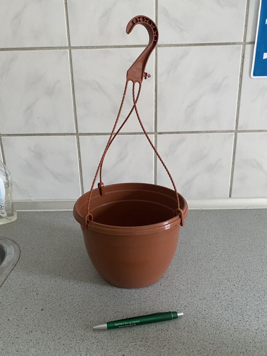 I kraftig plast - diameter 20 cm inkl. ophæng kan bruges til mange forskellige planter - f.eks Jordbær i dit Strong drivhus - det gør vi, og plejer at have friske jordbær i starten af Maj - kan også bruges til sommerblomster, hængetomater osv.