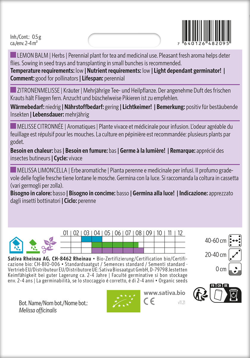 Beskrivelse: En hårdfør og dekorativ krydderurt med smukt grønt løv og rosalilla blomsterspirer. Man bruger de friske, citronduftende blade til madlavning og dekoration. Kan både sås på friland og forspires. Tiltrækker bier og er også smuk i staudebedet. Frostfølsom. Trives i de fleste jordtyper, både tørre og fugtige. Høstes løbende, inden skuddene begynder at blomstre.