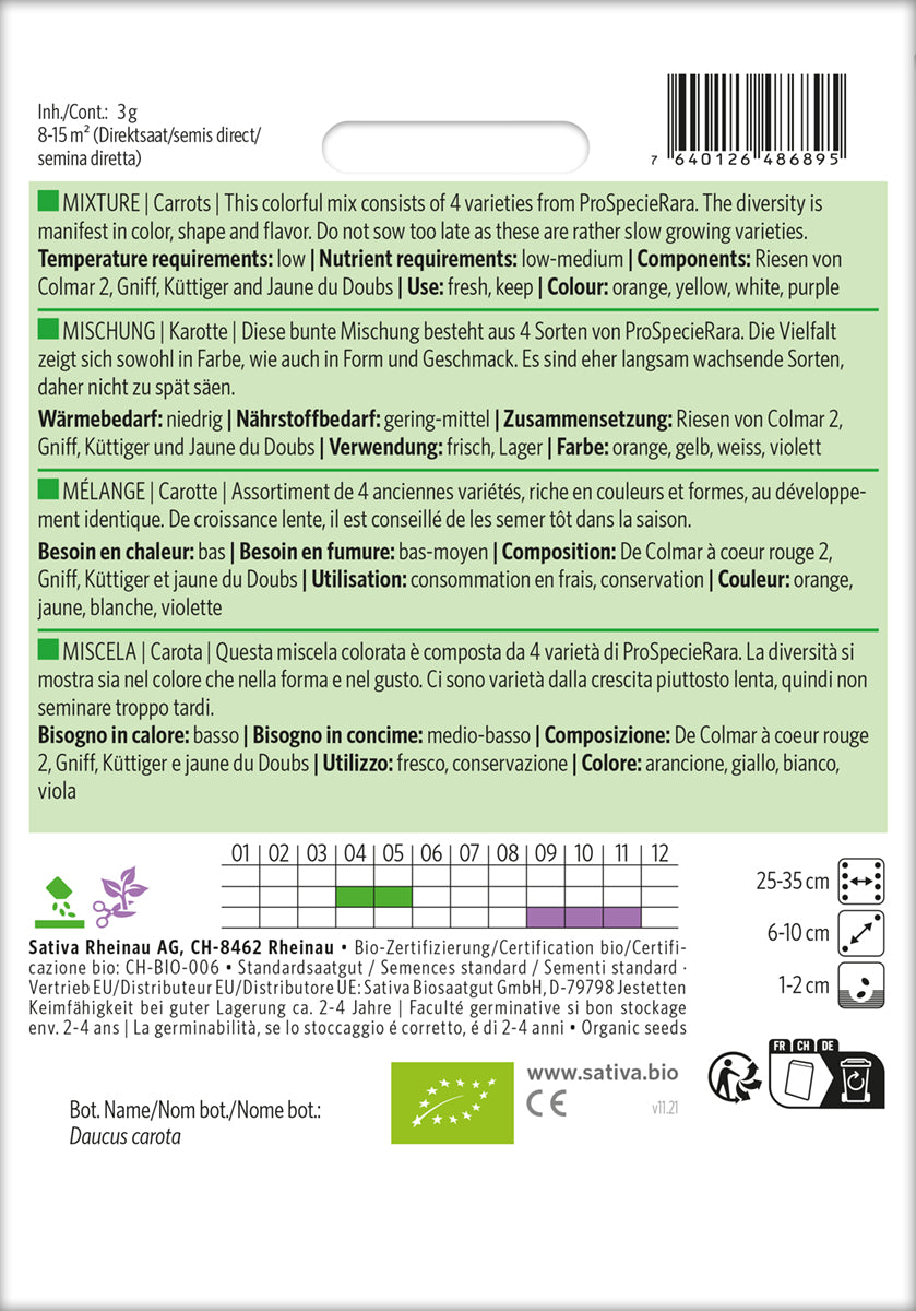 En super lækker blanding af 4 forskellige sorter af gulerødder. Mangfoldigheden er tydelig i både farve, form og smag. Der er Orange, gul, hvid og violette. De er ret langsomt voksende sorter, så så ikke for sent. Udvikles på 130-140 dage.