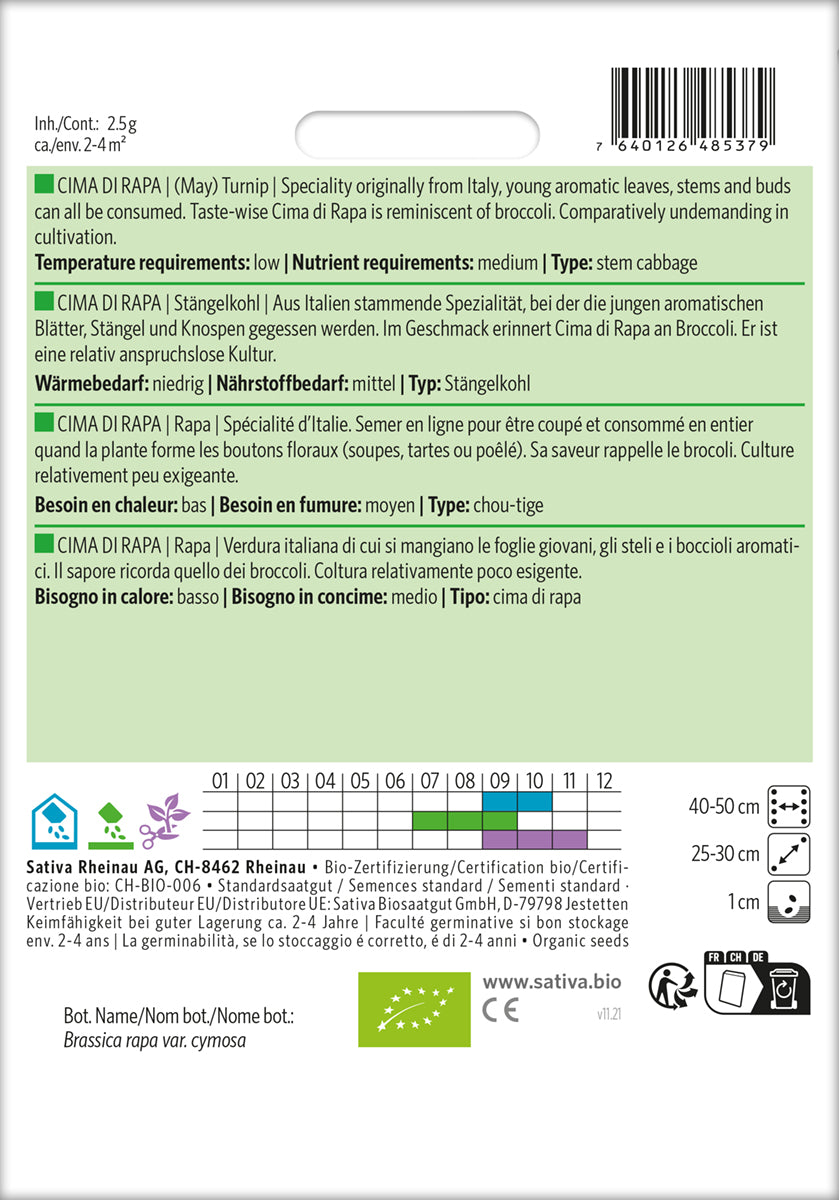 Specialitet oprindeligt fra Italien. Smagsmæssigt Cima di Rapa minder om broccoli. Forholdsmæssigt krævende i dyrkning.