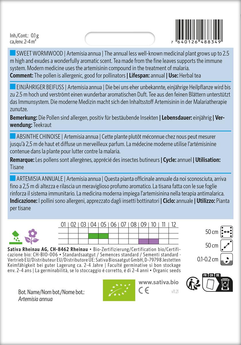 Denne 1 årig lægeplante bliver op til 2,5 m høj og udstråler en vidunderlig aromatisk duft. Te lavet af de fine blade understøtter immunforsvaret. Moderne medicin bruger artemisinin forbindelsen til behandling af malaria. Den har været brugt som lægeplante i Kina i over 2000 år.