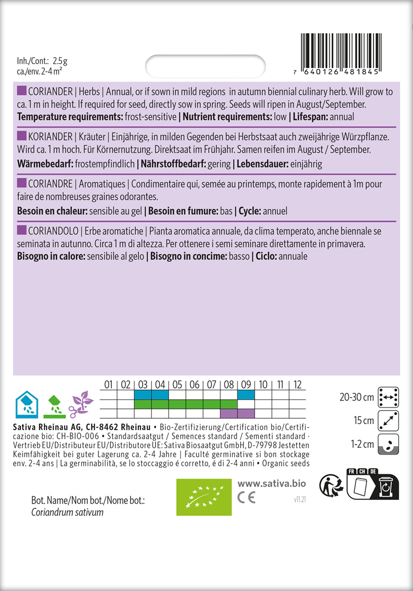 Frisk grøn koriander er en krydderurt, der i Danmark gror på friland i maj til september. I drivhus, vindueskarm o.lign. kan den ofte dyrkes længere.