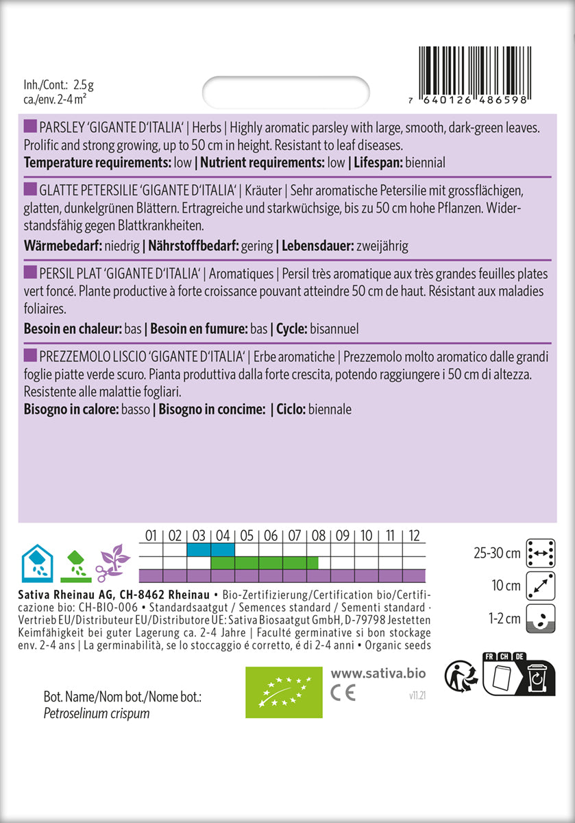 Meget aromatisk persille med store, glatte, mørkegrønne blade. Højtydende og kraftige planter op til 50 cm høje. Modstandsdygtig over for bladsygdomme.