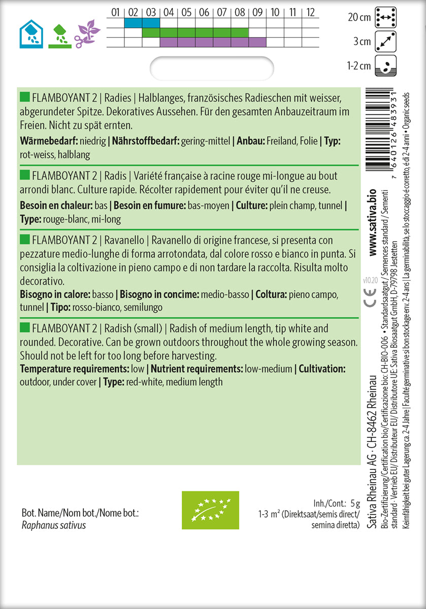 Halvlange franske radiser med en hvid, afrundet spids. En klassisk radis, sprøde og med en god smag. Flamboyant er robust og går ikke så let i stok.