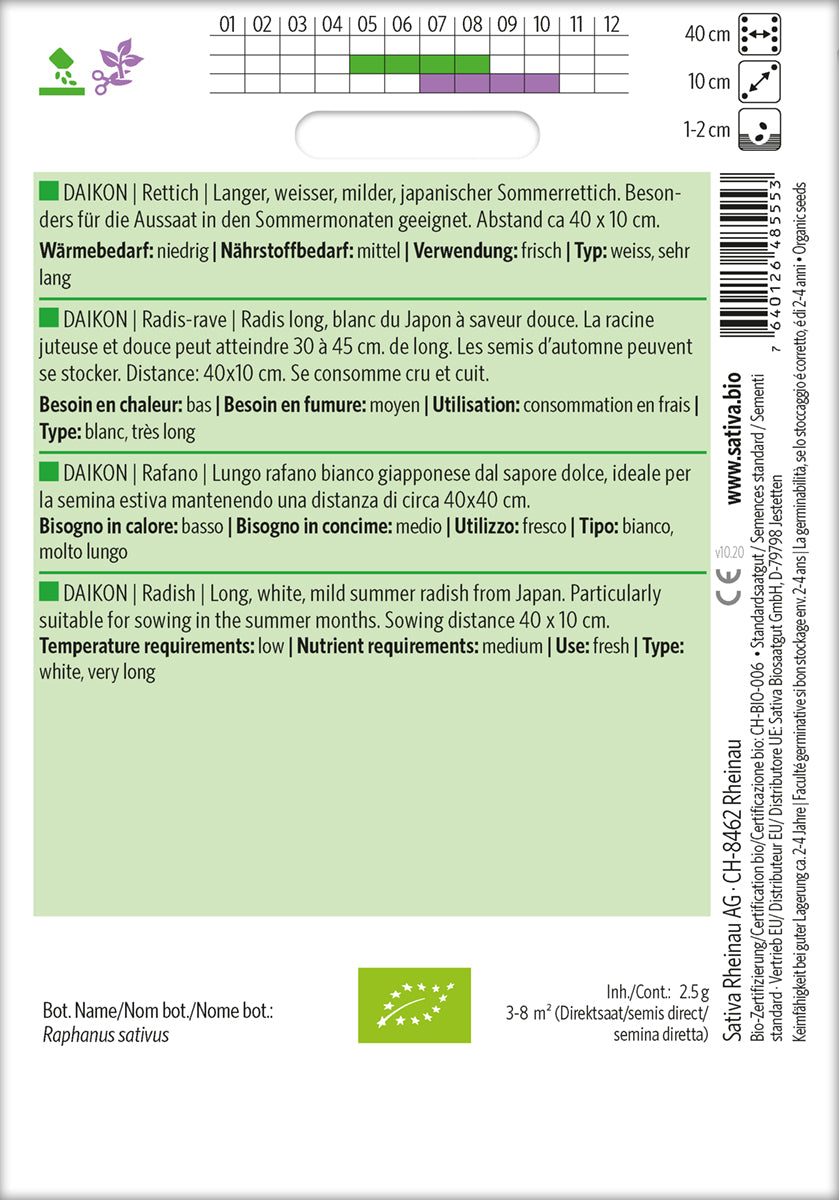 Lang, hvid, mild radise. Særligt velegnet til såning i sommermånederne. Så afstand 40 x 10 cm. Farve: hvid Type: meget lang, hvid