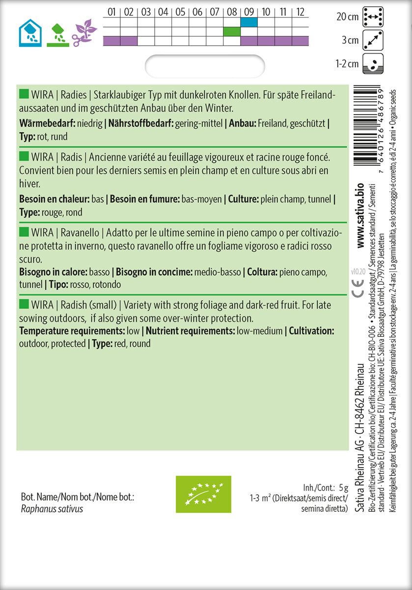 Radise med mørkerød frugt. Til sen såning udendørs, hvis der også gives en vis beskyttelse over vinteren. Type: rød, rund . Lækker smag.
