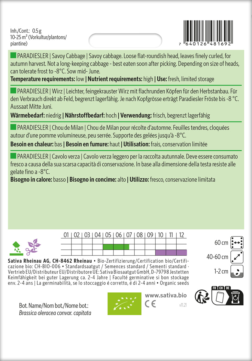 Savoy kål. Løst fladt-rundt hoved, blade fint krøllede, til efterårets høst. Ikke en langtidsholdbar kål - spises bedst hurtigt efter plukning. Afhængigt af hovedets størrelse kan den tåle frost til -8°C. Sås medio juni.