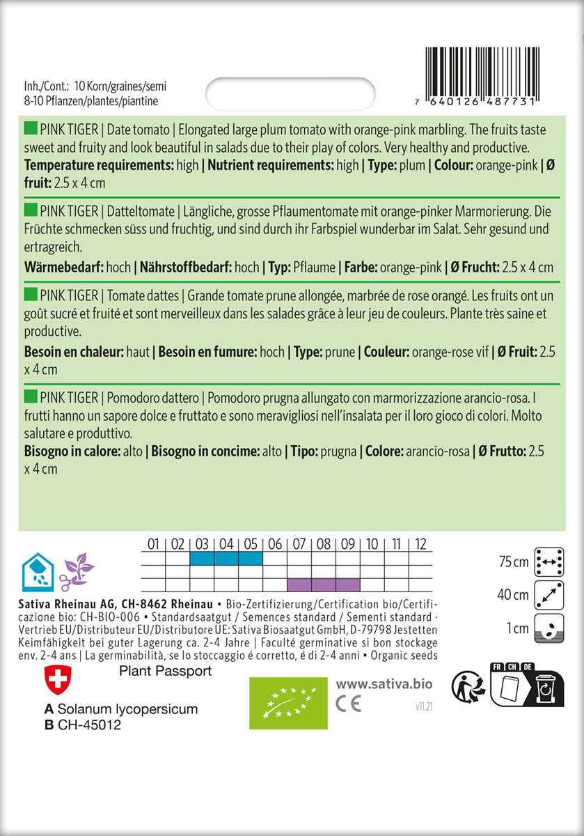 Aflang, stor blommetomat med orange-lyserød marmorering. Frugterne smager sødt og frugtigt og er skønne i salater takket være deres farvespil. Meget sund og produktiv.