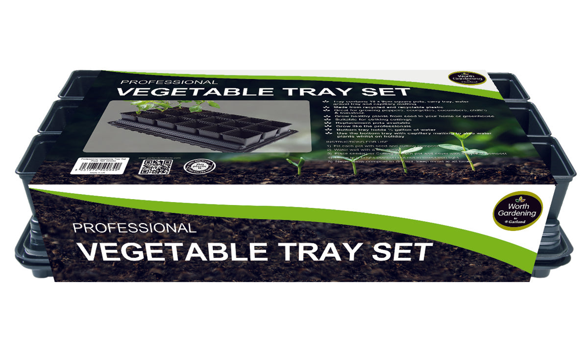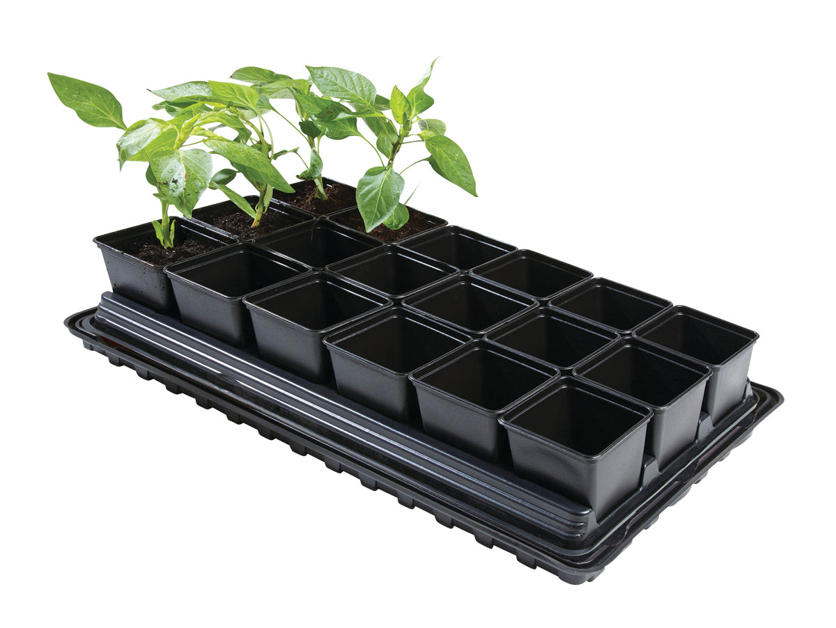Sættet indeholder Bakke med 18 stk 9 cm potter, holder til potter, vandingsbakke og kapillær måtte