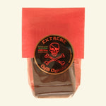 Mørk chokolade (60%) med bhut jolokia, super lækker stærk chokolade. spis den som den er, brug den smeltet som chokoladesauce til desserten eller prøv den i chili con carne!