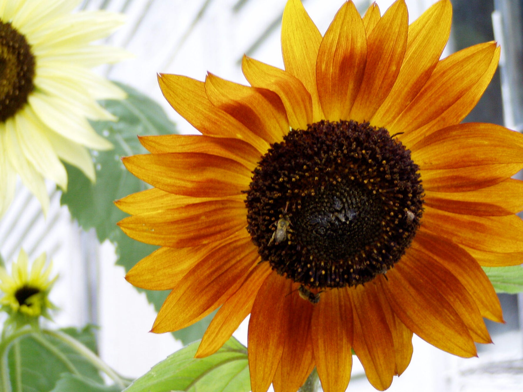 Solsikke, helianthus anuus, Autumn beauty er nogle af de solsikker, som får folk til at knække nakken, når den skal beskues. Den 2-3 m. høje solsikke får mange hoveder på hver plante i varme røde og gule farver.