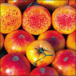 Store tomater som stammer fra bjergene i West Virginia, USA. Lys orange frugt med røde og pink striber - super dekorative, meget milde og velsmagende. Minimum 10 frø
