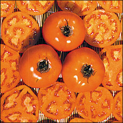 Plant produces good yields of 1 lb apricot-orange tomatoes. The tomatoes are very juicy with yellow interior. Serve slices on a plaster for a delicious gourmet dish. Tomato is relatively crack free. A great heirloom variety. Minimum 10 frø