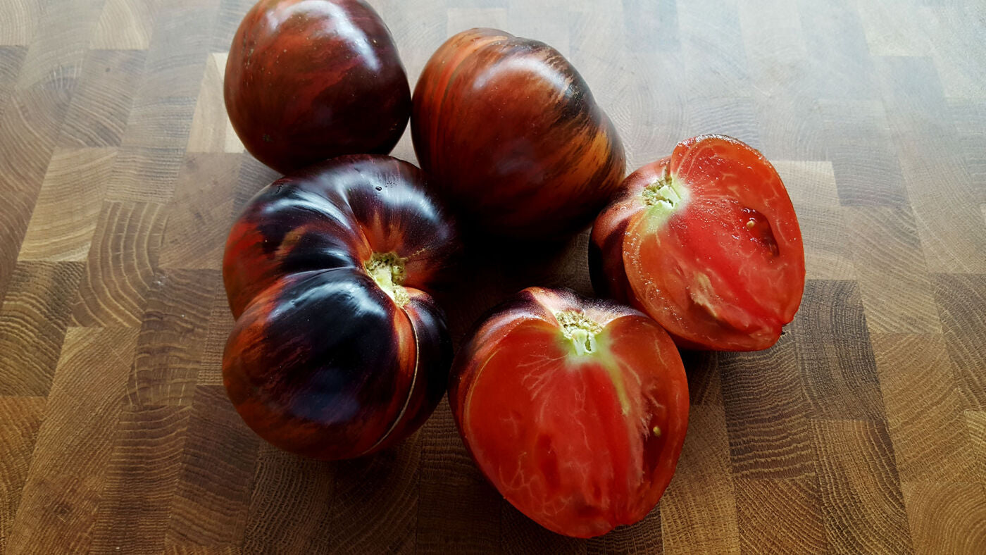 En super smuk og meget mørk hjerte formet tomat. Kødet har en dyb rød farve og smagen er ganske enkelt himmelsk (UMAMI)