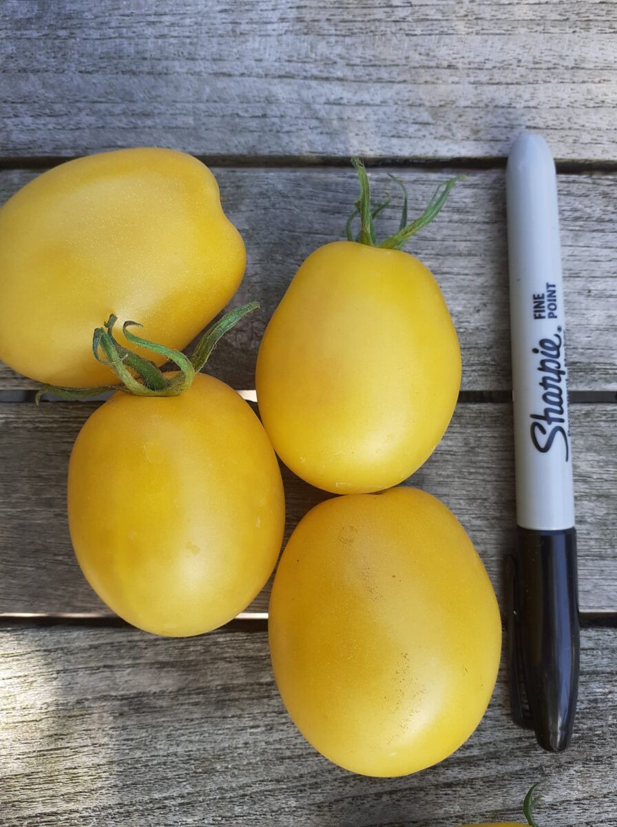 Blege, elfenbensfarvede tomater, der til sidst bliver cremet-gule og har en mild sød smag. Tomaterne bliver på størrelse med et hønse æg.
