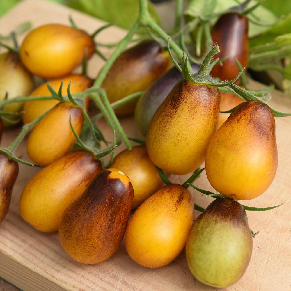 En anden fantastisk sort fra Indigo-avlsprogrammet, der producerer enorme afgrøder (600-800 frugter pr. plante) af pæreformede kirsebærstørrelser med solrig orange hud, der modnes med indigo lilla farvede skuldre. Smagen er fremragende, delikat sød og afbalanceret med god tomatsmag. Disse er de bedste væksthuse, der dyrkes i Storbritannien, men kan dyrkes udendørs med forbehold for en rimelig sommer i Storbritannien på et meget solrigt, varmt beskyttet sted.