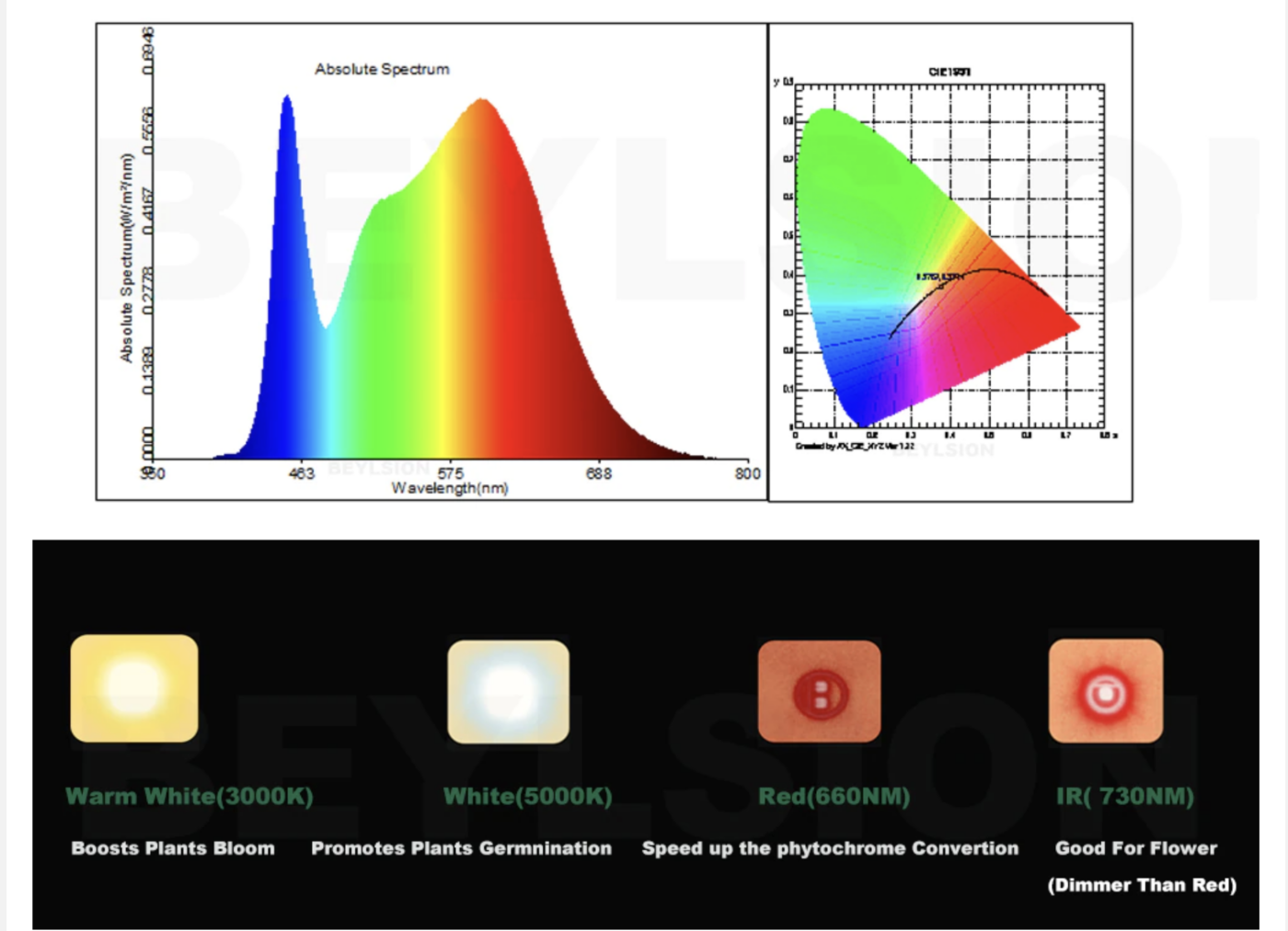 • Full Spectrum:3000K~101PCS 5000K~96PCS660NM~27PCS 730NM~1PC380NM~1PC