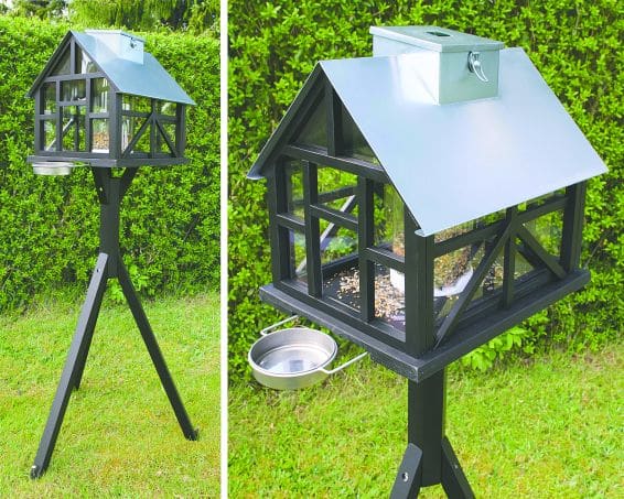• Fodersilo med vippelåg for nem påfyldning af 3-4 kg vildtfugleblanding (medfølger ikke)