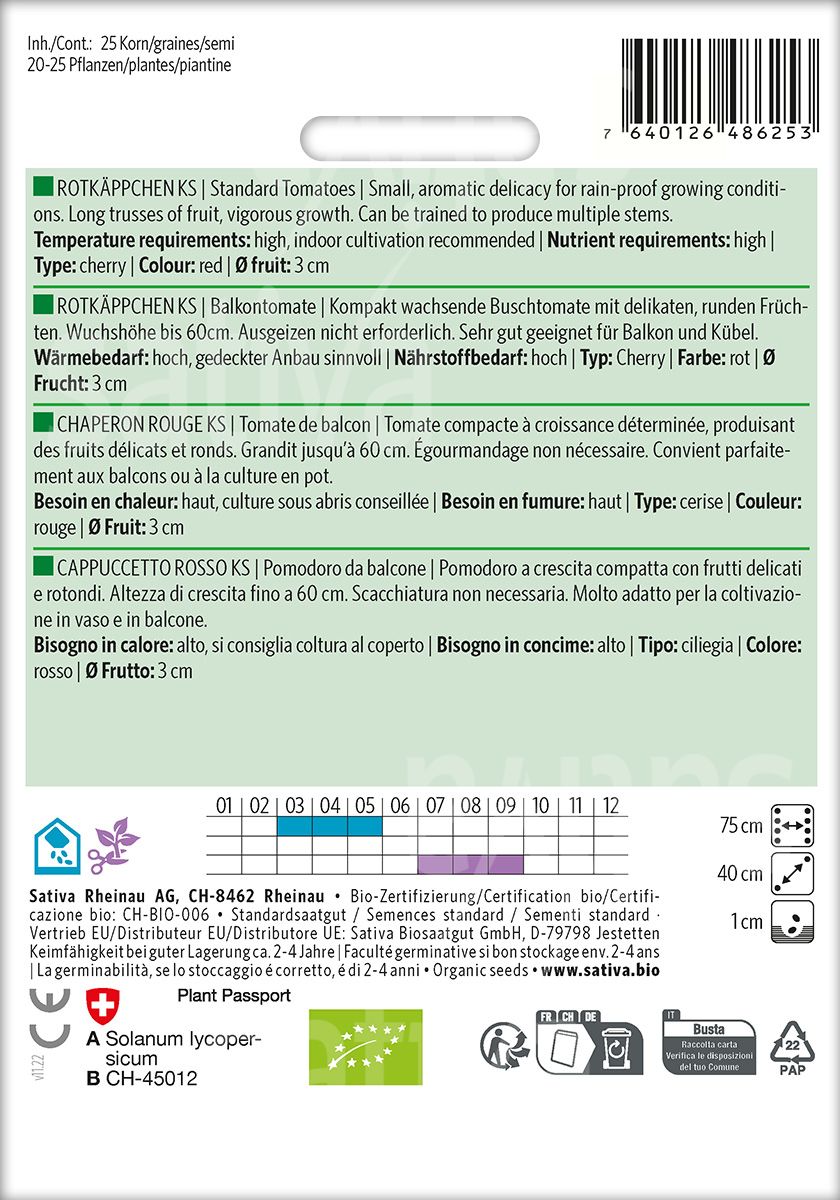 Lille af størrelse – stor på smag! Rotkäppchen KS er en intens, aromatisk cherrytomat, der leverer lange klaser med smukke, røde frugter på ca. 3 cm og 20 g stykket. Den har en kraftig vækst og kan dyrkes med én eller flere stammer, alt efter plads og ønske. Ideel til dig, der dyrker i drivhus eller under overdækning – denne sort trives bedst, hvor regnen holdes ude og varmen bevares.
