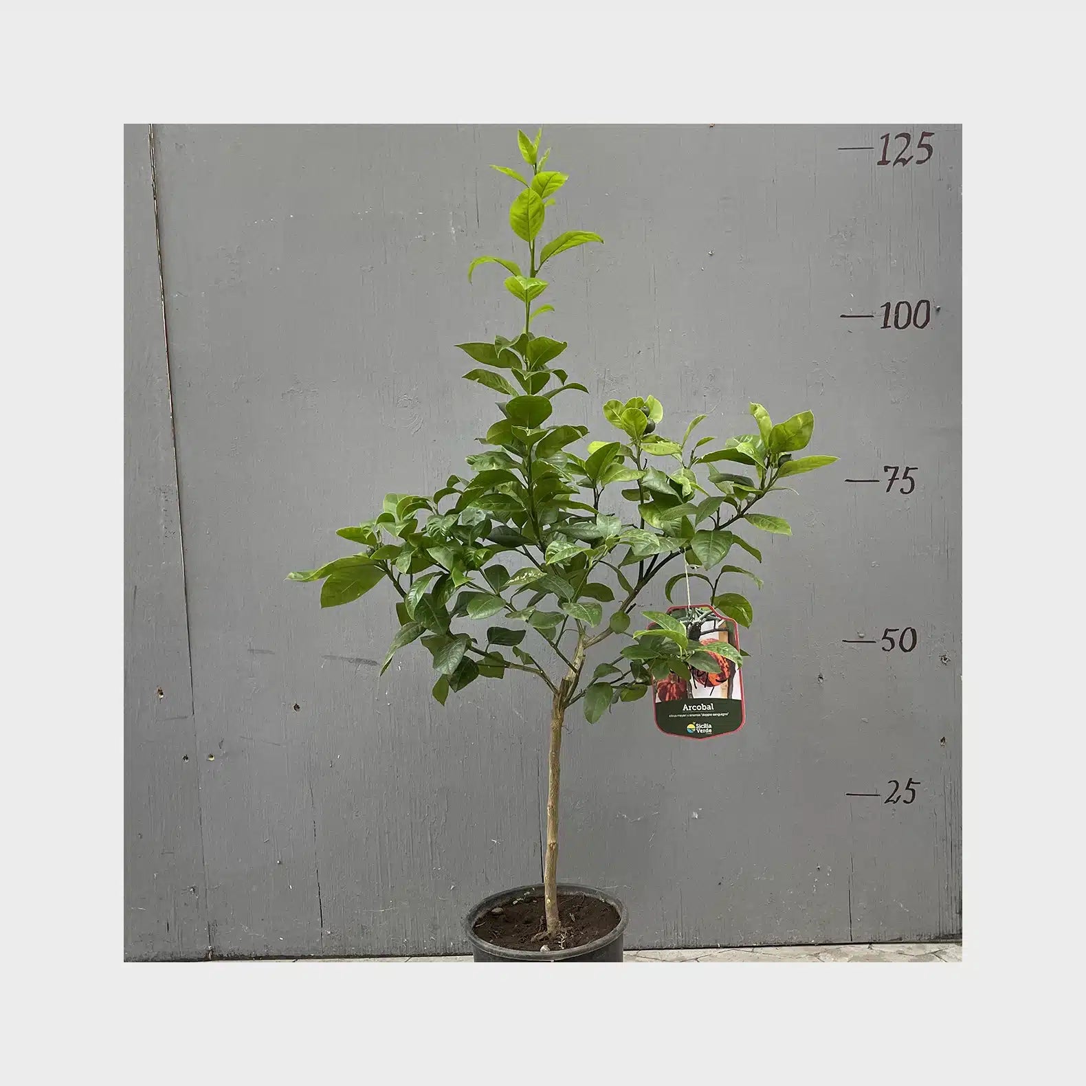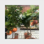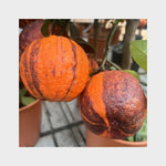Frugten på arcobal er et fantastisk syn med røde og orange striber. En spændende hybrid mellem meyers citron og en blodappelsin. Her i en flot opstammet udgave.