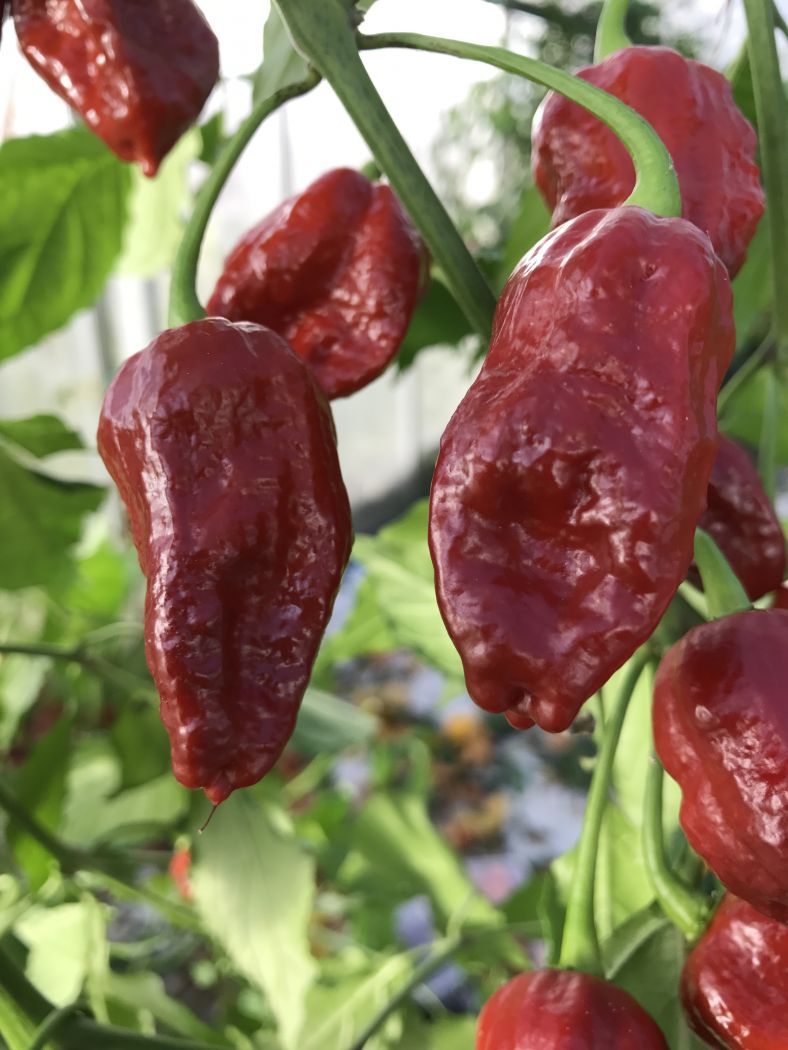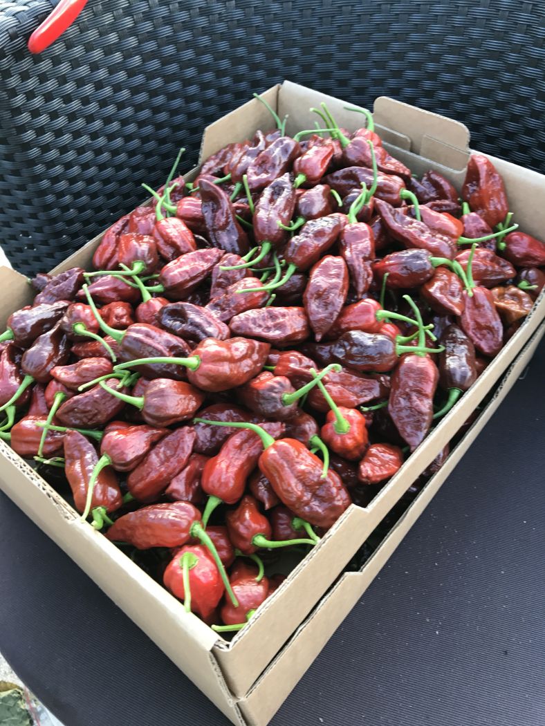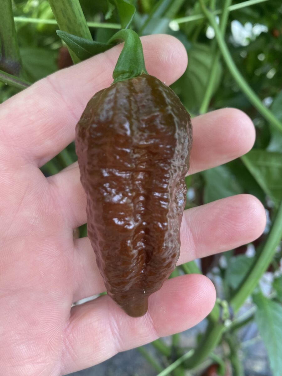 Det er en krydsning mellem Naga Morich og Trinidad Douglah. Store kraftige planter der sætter rigtig mange lækre chokoladefarvede frugter på 3 x 7 cm. Tag ikke fejl - de er stærke - meget stærke sandsynligvis helt op imod 1,5 mio SHU smagen er frugtig med en lille antydning af Naga.