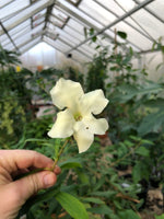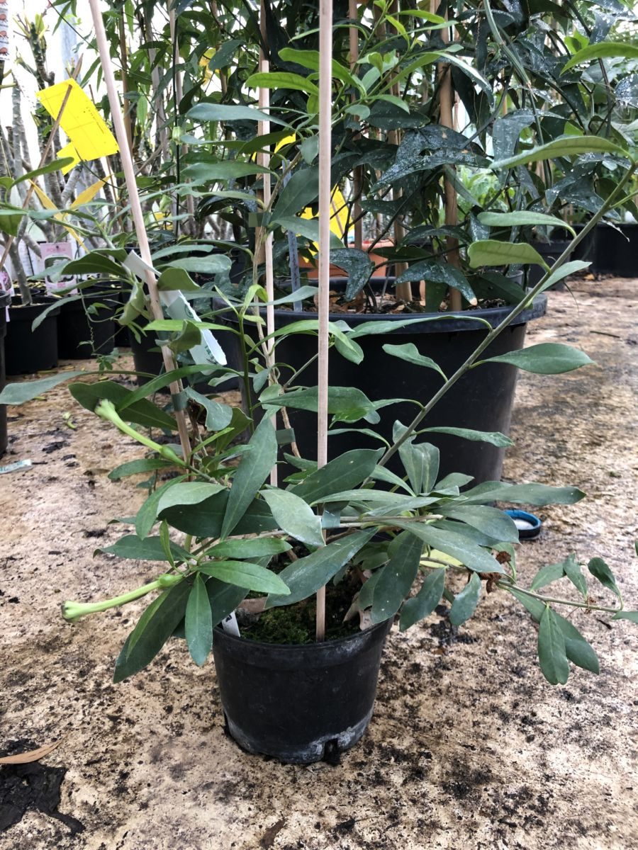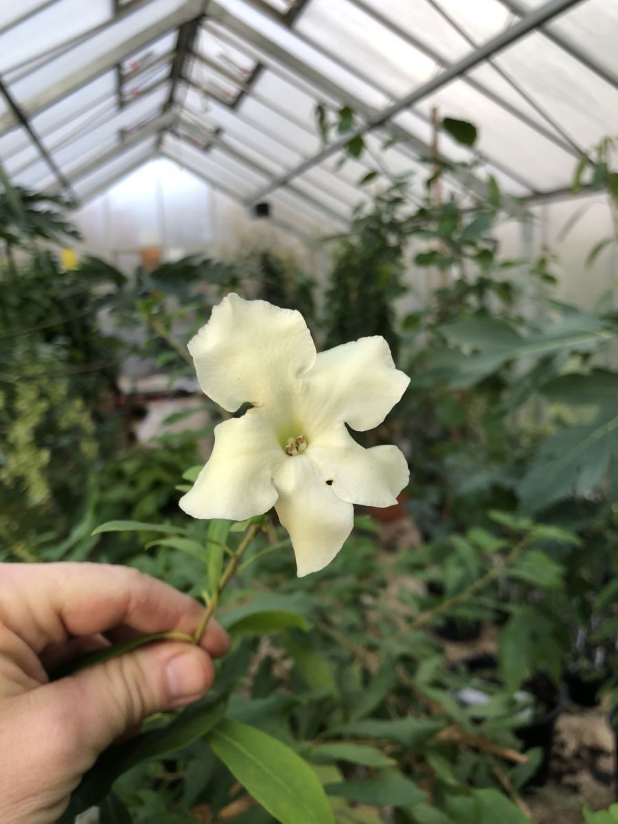 Brunfelsia nitida - en anderledes Brunfelsia, da denne får hvide blomster - hvor langt de fleste får blomster i lilla nuancer. Det er en lille busk som kan blive op til 2 meter høj - den tåler ikke frost. Du får panten på billedet i galleriet.