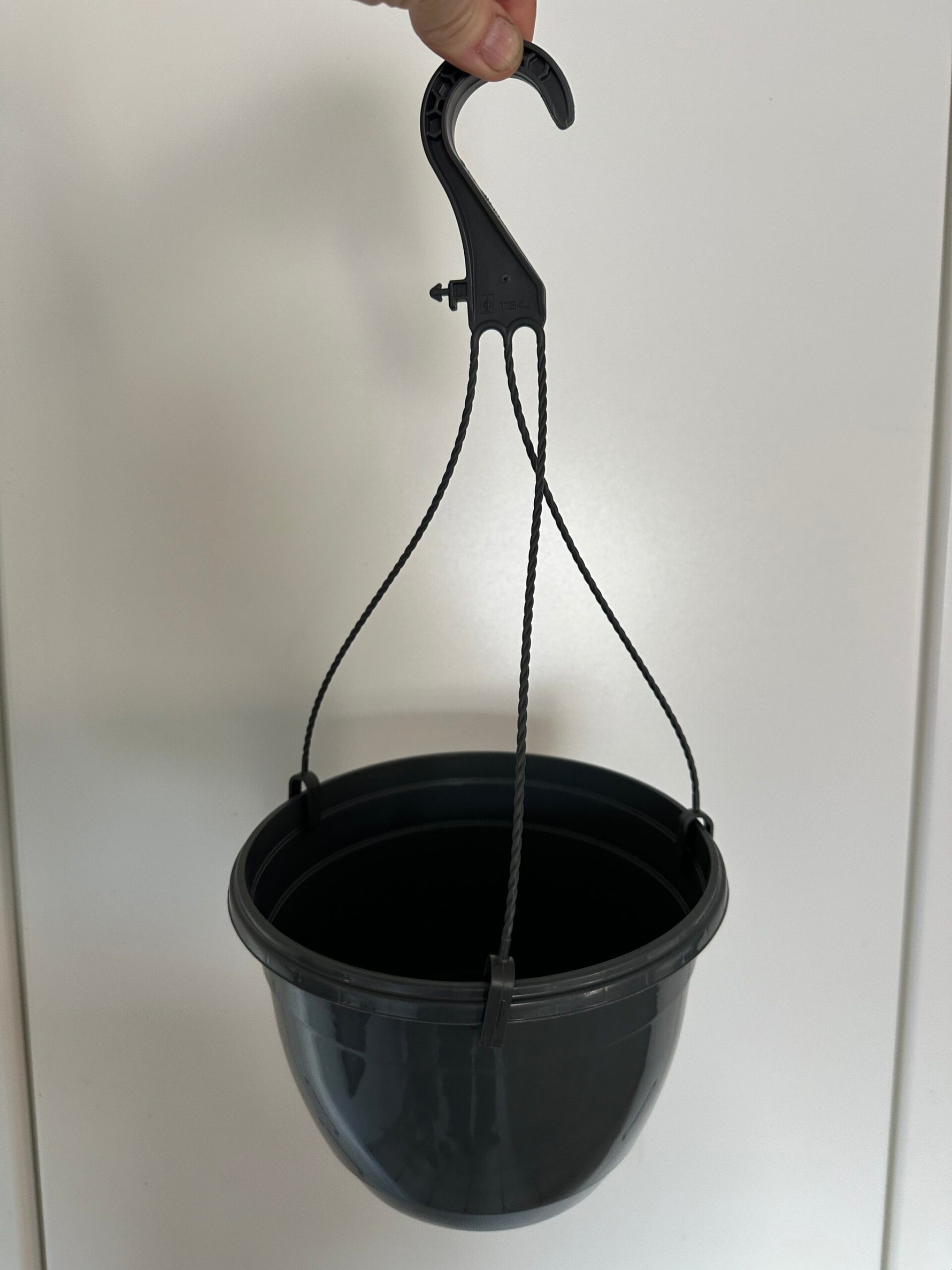 I kraftig plast - diameter 20 cm inkl. ophæng kan bruges til mange forskellige planter - f.eks Jordbær i dit Strong drivhus - det gør vi, og plejer at have friske jordbær i starten af Maj - kan også bruges til sommerblomster, hængetomater osv.