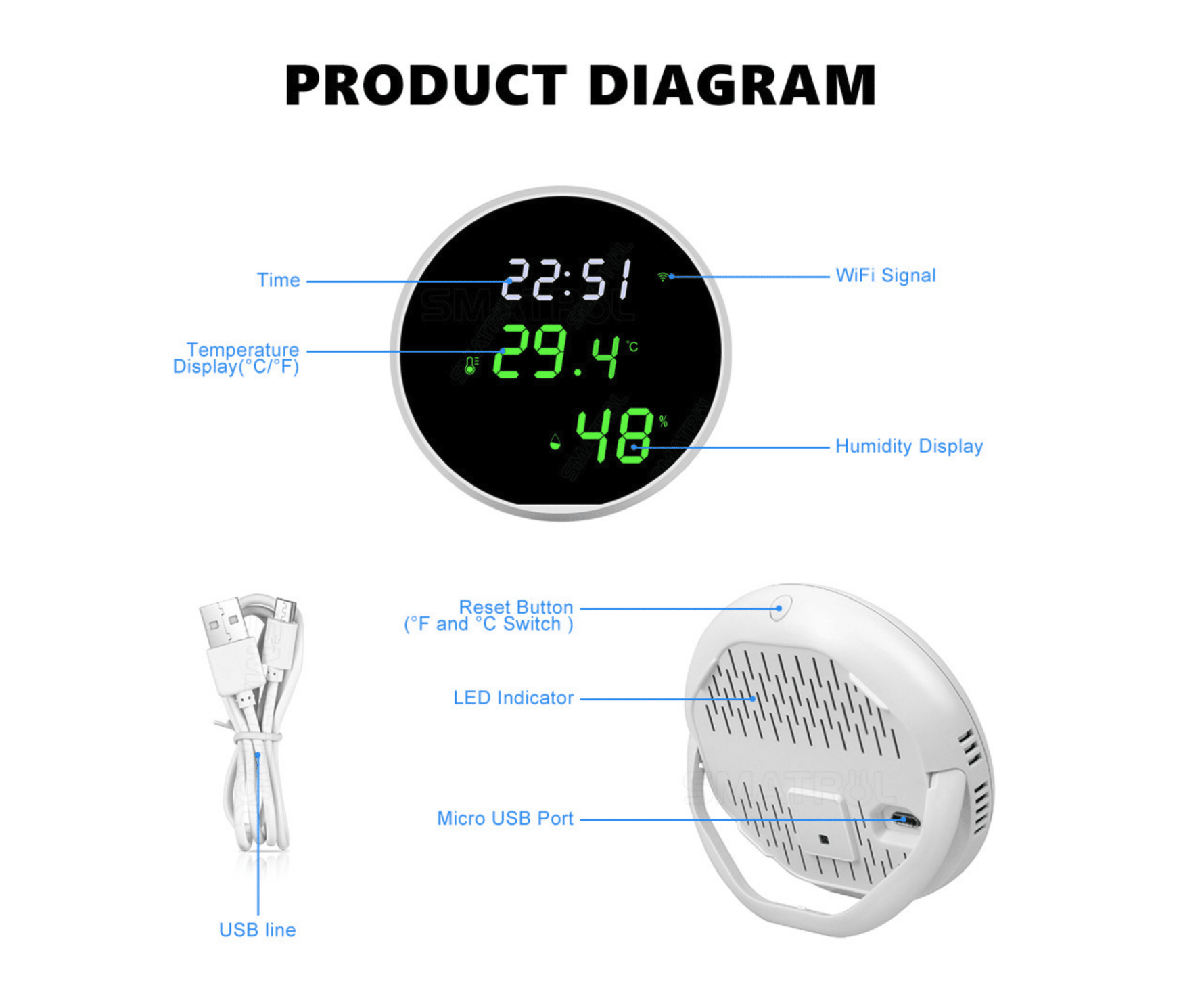 Smart WiFi-termometer enhed, der bruger trådløs teknologi (typisk WiFi) til at forbinde sig til dit hjemmenetværk. Dette termometer er udstyret med sensorer til at måle temperatur, og det kan sende disse målinger til en tilknyttet app eller cloud-platform via internettet. Dette gør det muligt for brugeren at overvåge temperaturen på afstand ved hjælp af en smartphone, tablet eller computer.