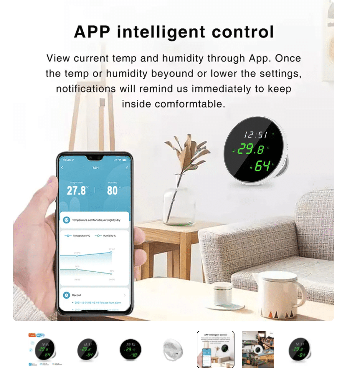 Når temperatur- og luftfugtigheds ændringen er lille, vil sensoren rapportere. Du kan kontrollere værdiændringerne på APP'en eller skærmen. Ændringer i temperatur og luftfugtighed registreres på APP'en og præsenteres for dig i form af en graf.