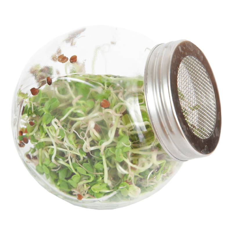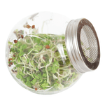 Drys en skefuld frø i glasset og tilsæt kun lunkent vand. Vend låget på glasset og dræn det godt af og skyl 2 - 3 gange om dagen