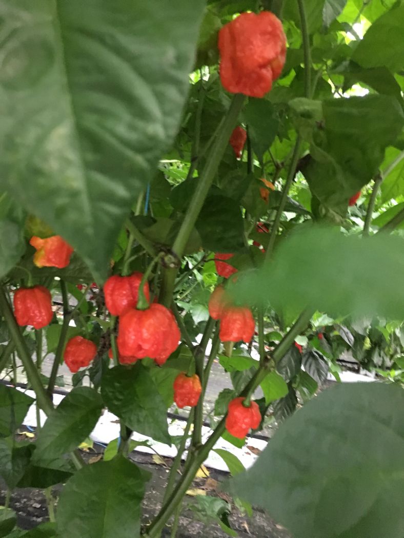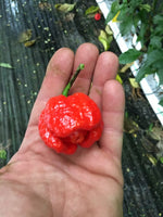 Verdens stærkeste chili!. Den kommer fra Trinidad. Planten kan blive op til 150 cm høj og sætter en god del frugter. Frugterne modner fra grøn til fristende rød. De er utrolig smukke, men kender man lidt til chili ved man at her er en man skal passe på: dens runkne overflade og dens markante facon afslører den. Styrke 1,5-2 mio SHU!!!!